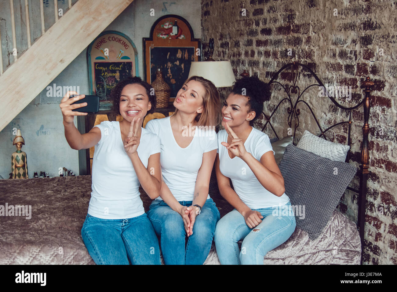 Description: Beautiful and funny girls in white T shirts makes selfie Two