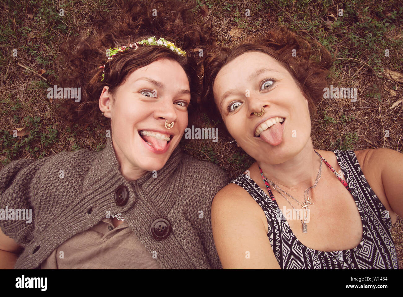 Description: Two funny girls showing their tongues in nature Stock Photo